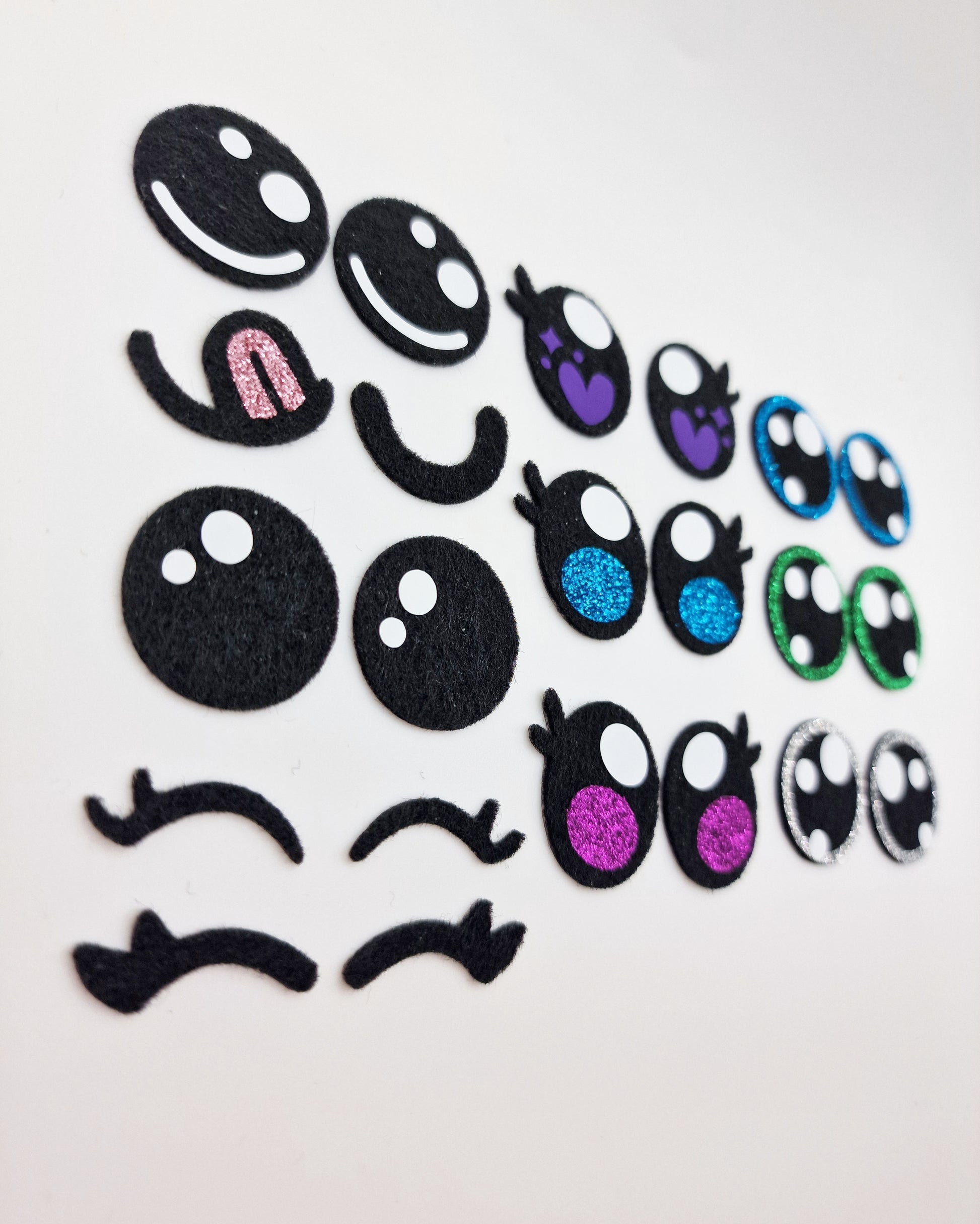 You get: 8 pairs of felt eyes, 2 sets of eyelashes, 2 mouths.